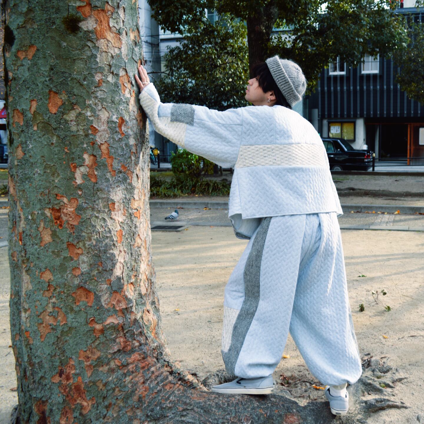 柔らかい着心地とサイドのライン、パッチワークなどがポイント