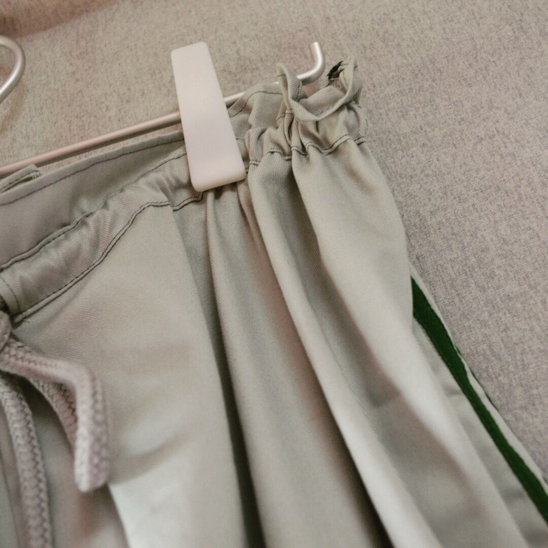 くすんだアッシュグレーの生地にグリーンのラインが効いてます^^